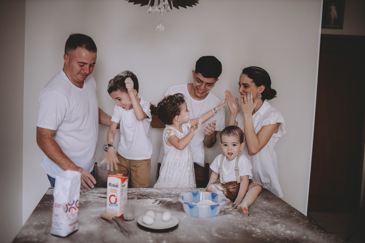 todo mundo ajuda, enquanto a mãe termina de se arrumar para nossa sessão